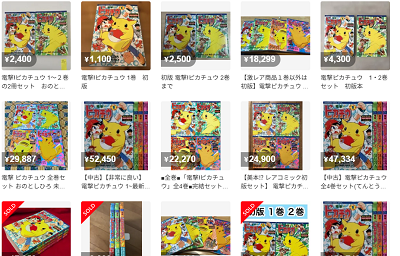 確かに出品はたくさんあるけど・・電撃ピカチュウの単行本は、紙版しかないから、ちょっと相場も高いみたい..。